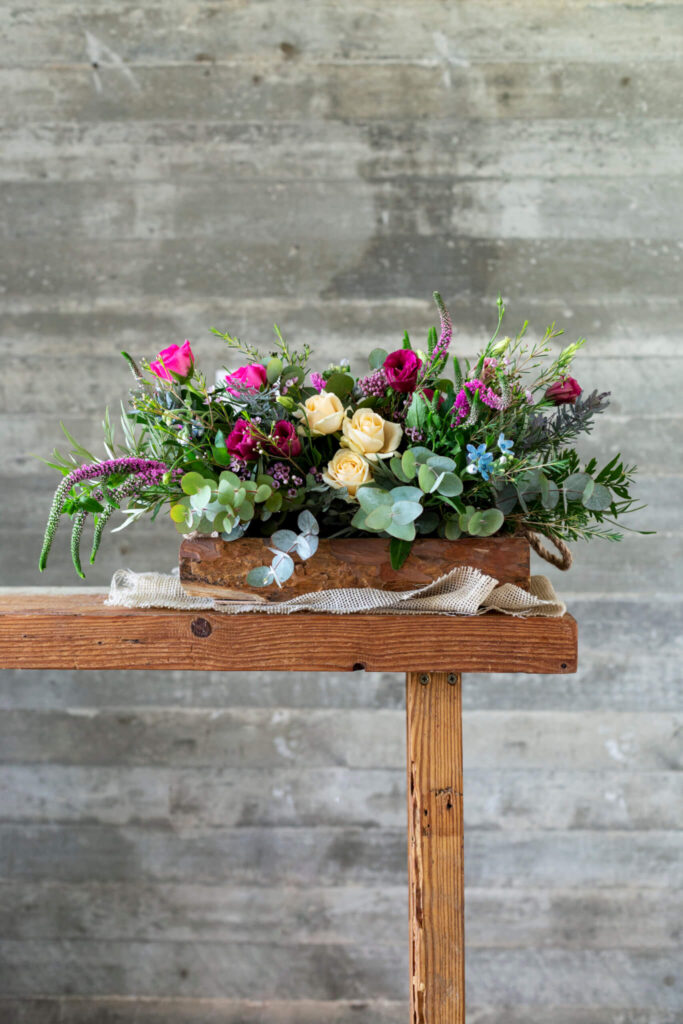 מסביב לשולחן השזירה אנחנו יוצרים זרי פרחים שמרגישים כמעט כמו בשדה.